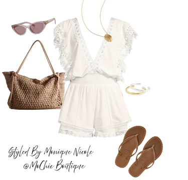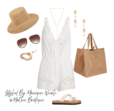 Sleep romper turned stylish daytime beach Cover-Up: This effortless piece I styled is both feminine and functional. Style with a large raffia tote, straw bucket hat and classic aviator sunnies for a coastal vibe. Add some gold and pearl jewelry for the perfect touch of beachy elegance. Minimize your packing and double the versatility with this look! Perfect for lounging in the morning and strolling the shoreline by noon.