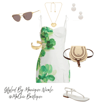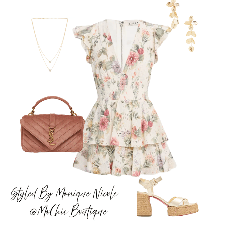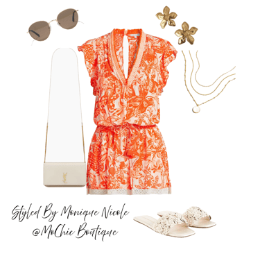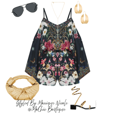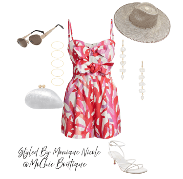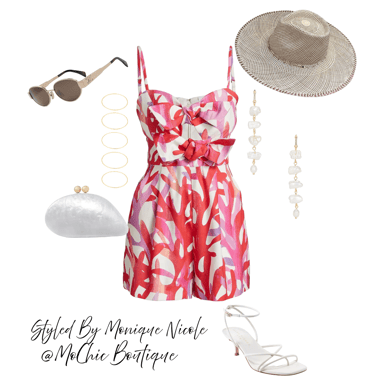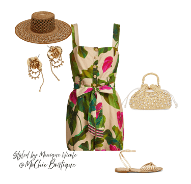 Tropical Chic Floral Print Romper: Perfect for garden parties or picnics, this vibrant and playful option is ideal for daytime outings. The romper selected is a spaghetti strap floral cotton skort romper with a flattering fit and breezy summer vibes.