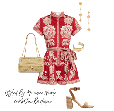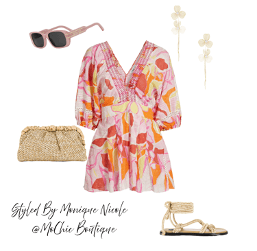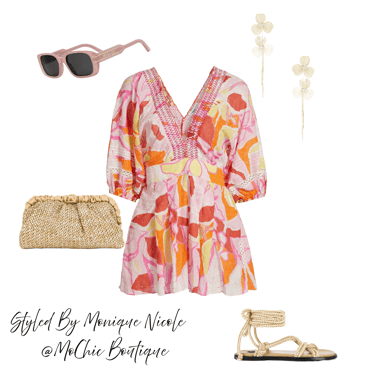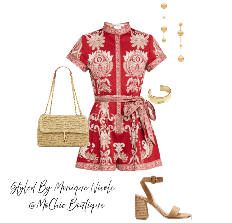 Short-Sleeve Romper: This versatile choice easily transitions from day to night with the right accessories. The beautiful colorful short-sleeve romper styled here, pairs well with some rope sandals, a woven natural clutch that adds a breezy coastal vibe, while rectangle sunglasses give a touch of modern edge. Finished with delicate daisy earrings for a flirty, floral finish.