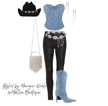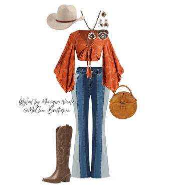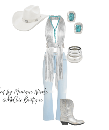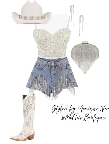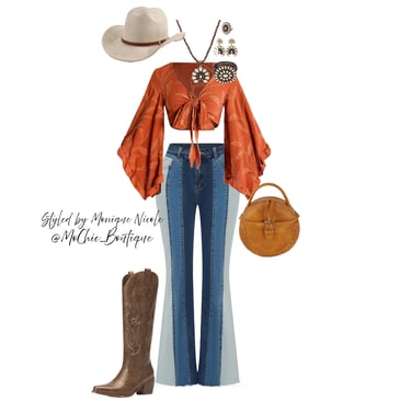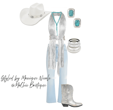 **Cowboy Carter Glamour**: Channeling the fearless fusion of Western grit and high fashion sparkle, these Boho Western pieces shine with unapologetic glam. Think fringe with rhinestones, denim dusted in shimmer, and prairies silhouettes reimagined with metallic threads. Inspired by Cowboy Carter, it's outlaw energy meets star-studded stage-bold, untamed, and dripping in attitude.