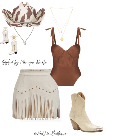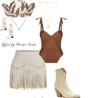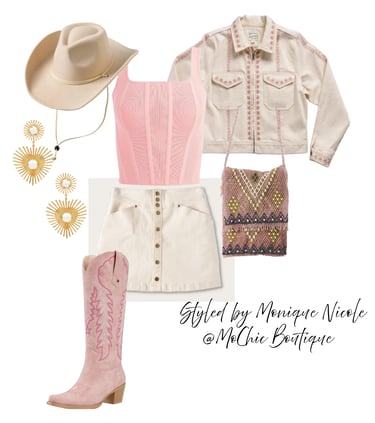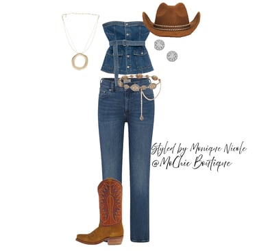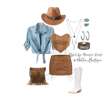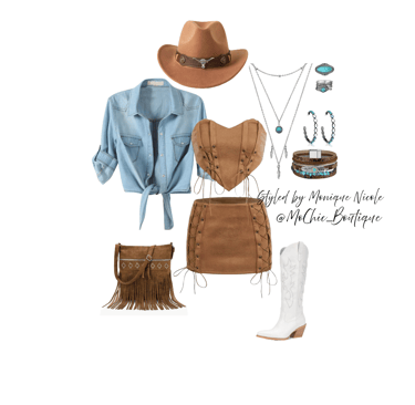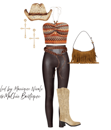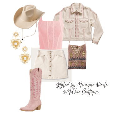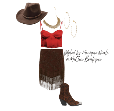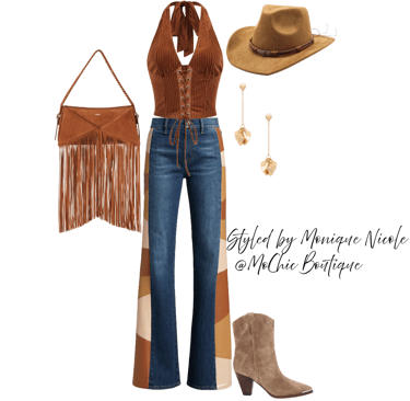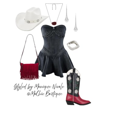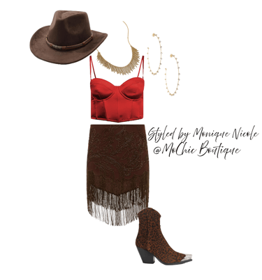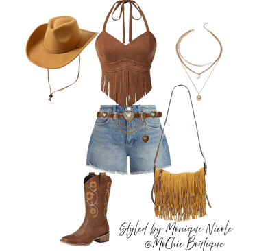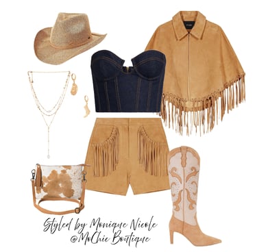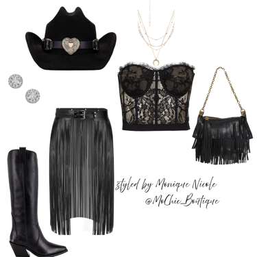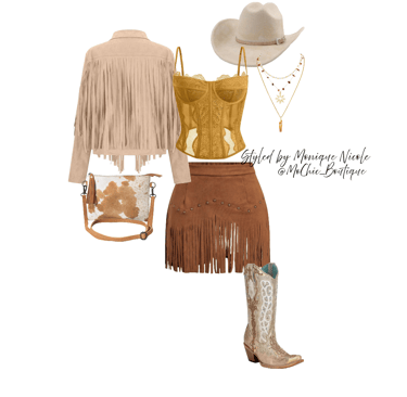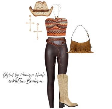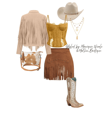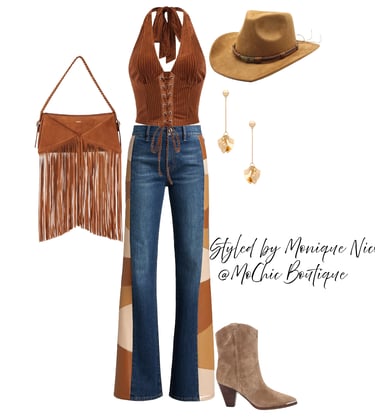 **Wild West Whimsy: Fringe and Corsets**: Saddle up for a look that rides the line between rugged and romantic. Soft suede fringe dances with every move, while structured corsets cinch the silhouette with fierce feminity. It's Boho Western at its boldest-where prairie rebellion meets saloon glamour. Earthy tones, antique lacing, and statement textures tell a story of strength, sensuality and untamed style.