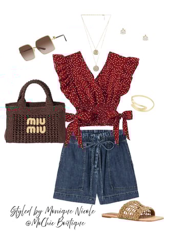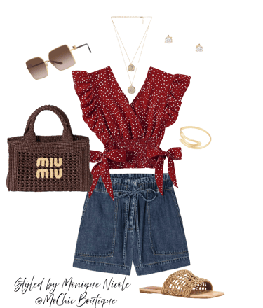 Ruffle & Raffia: Chic Summer Day Look with Denim Paper Bag Shorts: Stay cool and stylish in this effortlessly chic summer look featuring high-waisted denim paper bag shorts paired with a v-neck crop blouse with ruffle cap sleeves and a side bow-knot hem. Accessorized with a raffia woven bag, square oversized sunnies, gold layered necklace, bold gold upper arm cuff, diamond stud earrings, and natural-toned flat sandals—this outfit is perfect for sunny days!
