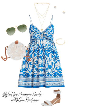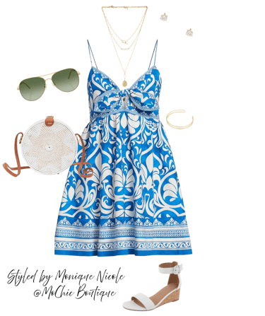 Boho Breeze: Blue & White Linen Mini with Golden Summer Touches: Channel effortless coastal vibes in this boho blue and white linen mini dress—lightweight, flirty, and perfect for sunny days. Styled with wedge sandals, a handmade rattan straw crossbody bag, gold diamond stud earrings, a gold cuff bracelet, layered gold necklaces, and classic aviator sunglasses. A dreamy look for beach barbecues.