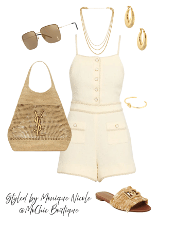 Chic in Bouclé: Scalloped Romper & Raffia Summer Accessories: elevate your summer wardrobe with this polished yet playful ivory bouclé romper featuring delicate scalloped trim, a square neckline, and partial button front. Styled with logo woven sandals, a classic raffia tote, square mirrored sunglasses, gold layered necklaces, a chic knot cuff bracelet, and gold hoop earrings—this look balances timeless elegance with modern flair.
