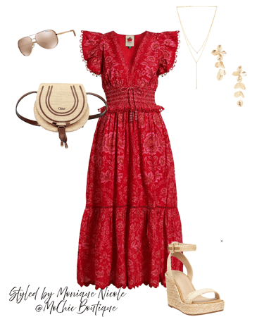 Bold & Breezy: Red Cotton Maxi with Gold Florals & Summer Texture: Make a vibrant statement in this red printed cotton maxi dress — flowy, breathable, and perfect for warm days. Paired with a raffia and leather saddle bag, aviator sunglasses, ankle-strap espadrille wedges, a layered gold necklace, and oversized floral gold statement earrings. A dreamy look for summer.