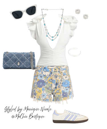 Floral Denim Vibes & Violet Samba Style: Step into summer with this effortlessly cool street-style outfit: floral print frayed denim jeans paired with a flirty ruffle sleeve bodysuit and cream/violet Adidas Sambas. Complete the look with a denim quilted crossbody bag, turquoise and silver layered necklaces, silver stud earrings, a bold silver cuff, and retro white cat-eye sunglasses. A fun mix of edgy denim and boho-chic vibes.