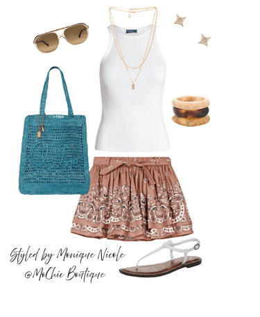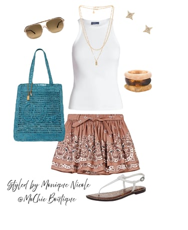 Boho Cool: Bandana Mini Skirt & Teal Crochet Tote Vibes: Serve casual-chic energy in this stylish warm-weather look featuring a brown bandana print mini skirt and a classic white ribbed tank. Finished with a teal crocheted logo tote, aviator sunglasses, gold stacked necklaces, resin bangles, diamond sparkle stud earrings, and comfy flat sandals.