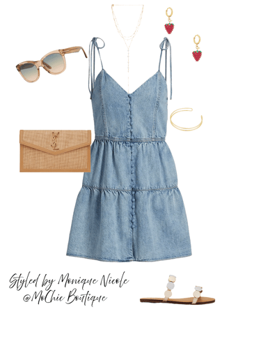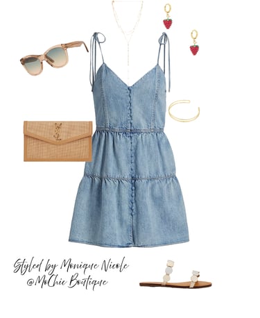 Sweet & Chic: Denim Mini Dress with Berry Cute Accessories: Keep it playful and polished in this denim mini tiered dress styled for sunshine days and weekend fun. Paired with a raffia pouch purse, two-toned sandals, cute sunnies, a layered gold necklace, strawberry and gold statement earrings, and a sleek gold arm cuff. Perfect for picnic-ready vibes with a stylish twist.