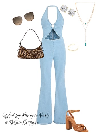 Wild & Woven: Denim Jumpsuit with Bold Prints & Gold Layers: Unleash your inner edge with this sleek denim jumpsuit styled to stand out. Paired with a fierce zebra print purse, woven block heels, and layered gold and turquoise multi-chain necklace for that bold statement. Finish the look with polarized fashion sunglasses, sparkling diamond earrings, and a chic gold arm cuff.