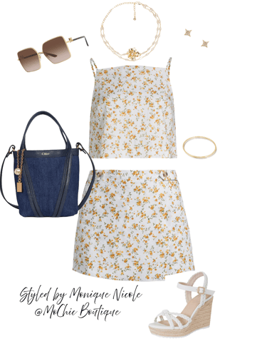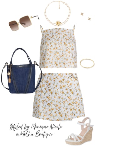 One of the hottest trends for the season is the matching set. These coordinate outfits are perfect for conveying an effortlessly chic appearance—ideal for summer BBQs. Look for sets made from soft, breathable materials, perfect for those hot days. My fave the Linen & Blooms: Floral Crop & Skirt Set with Sparkling Summer Details: Bask in the beauty of summer with this floral linen crop top and matching skirt set—light, breezy, and effortlessly feminine. Styled with a small denim tote, square oversized sunglasses, a crystal-layered flower necklace, gold diamond sparkle stud earrings, and a chic two-tone arm cuff set. Complete the look with classic espadrille wedge sandals a summer essential.