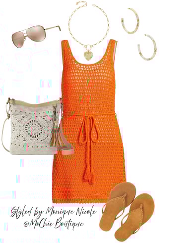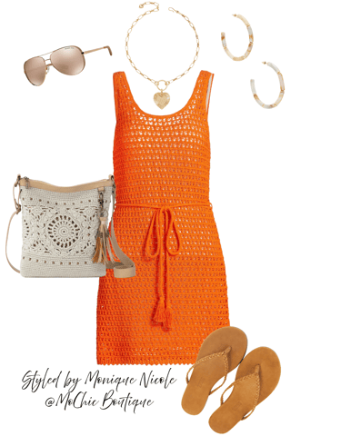 Sunset Ready: Orange Tie-Waist Mini Dress & Natural Boho Vibes: Turn up the heat in this vibrant orange tie-waist mini dress — the perfect blend of playful and chic. Styled with a crochet crossbody purse, gold heart pendant necklace, natural bamboo hoop earrings, camel braid sandals, and classic aviator sunglasses for an effortless boho-inspired summer look.