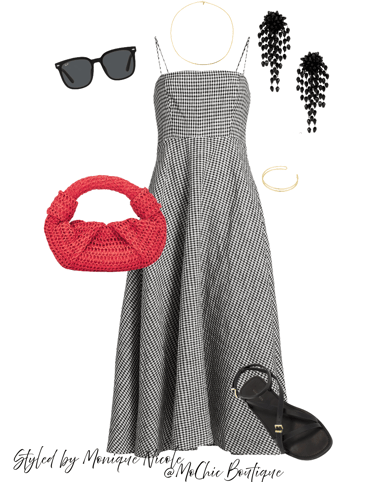Gingham & Glam: Classic Summer Midi with Bold Accessories: Step out in timeless style with this classic gingham print midi dress, perfect for sunny days and breezy evenings. Styled with a playful raffia lipstick-red bag, black dangle earrings, a slim gold chain necklace, black strappy sandals, a chic gold arm cuff, and square black sunglasses for a polished yet fun summer look. Ideal for garden parties, picnics, or strolling the city in style.