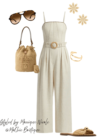 Golden Hour Glam: Wide-Leg Jumpsuit & Boho Luxe Accessories: Turn heads in this sophisticated wide-leg belted jumpsuit, the ultimate one-and-done piece for effortless style. Paired with a crochet and leather mini bucket bag, bold floral gold statement earrings, classic aviator sunglasses, a double open gold cuff, and knotted embellished slide sandals for that perfect balance of glam and boho. Ideal for rooftop brunches, summer events, or stylish strolls.