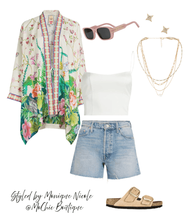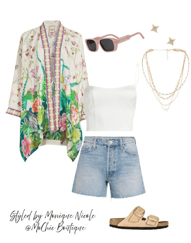 Kimono Cool: Add a luxe twist to your casual summer style with a floral silk kimono robe layered over frayed denim shorts — long or short, your choice of edge.