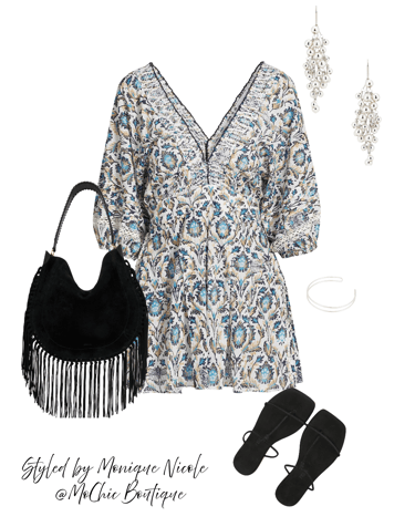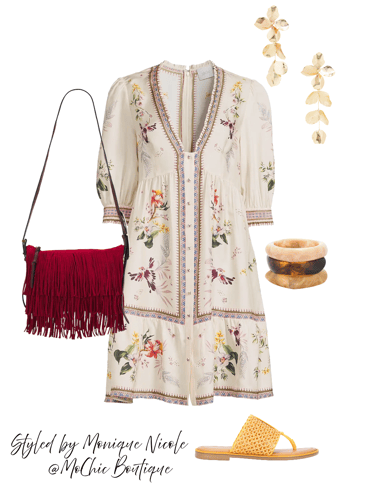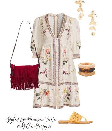 Boho in Bloom: Channel effortless summer freedom in a white floral v-neck boho dress that’s as breezy as it is beautiful. Styled with sunny yellow raffia sandals, a bold red fringe crossbody bag, and statement gold earrings, this look radiates vibrant energy.
