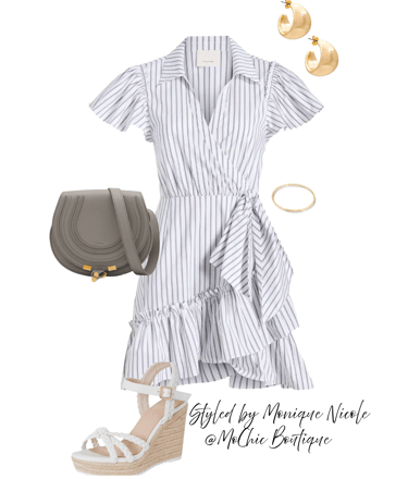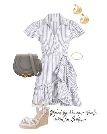 Wrapped in Style: Stay effortlessly elegant in a striped wrap dress styled with classic espadrille wedge sandals, a small calfskin crossbody bag.