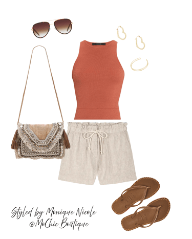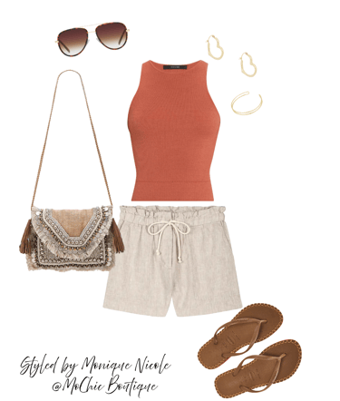 Earthy & Effortless: Stay cool and stylish with this earthy summer combo: high-waisted linen paper bag shorts paired with a classic racerback tank top.