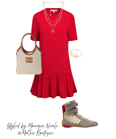 Sporty Chic: Step into effortless street style with this bold and comfy summer outfit: a red t-shirt dress styled with classic Adidas logo high-top sneakers.