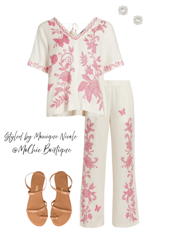 Printed Linen Perfection: Stay cool and coordinated in this effortlessly stylish white and pink printed linen outfit. A breezy v-neck blouse pairs perfectly with matching lightweight linen pants for a polished yet laid-back summer vibe.