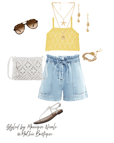 Seaside Boho: Embrace effortless summer energy with denim paper bag shorts and a sunshine-yellow crochet tank top — the perfect pairing for hot days and breezy nights.