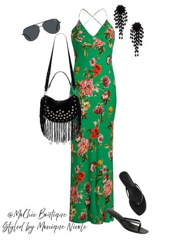 Slip into summer with this effortlessly chic look featuring a long green floral maxi slip dress — lightweight, flowy, and full of charm.