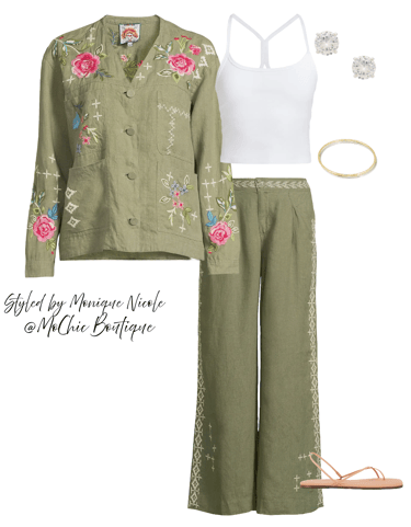Channel soft sophistication with this effortlessly chic summer outfit: a floral embroidered linen jacket paired with matching wide-leg linen pants and a simple racerback crop tank.