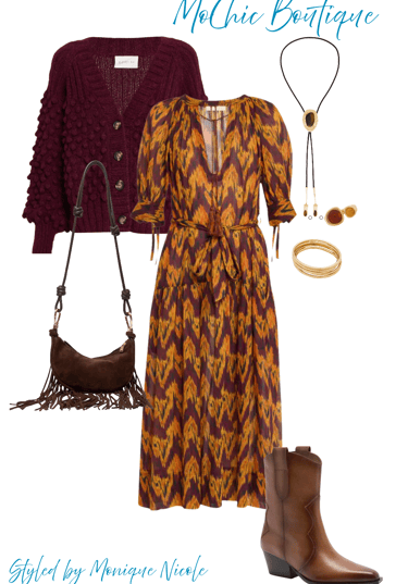 • Merlot Popcorn Cardigan & Puff Sleeve Maxi