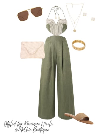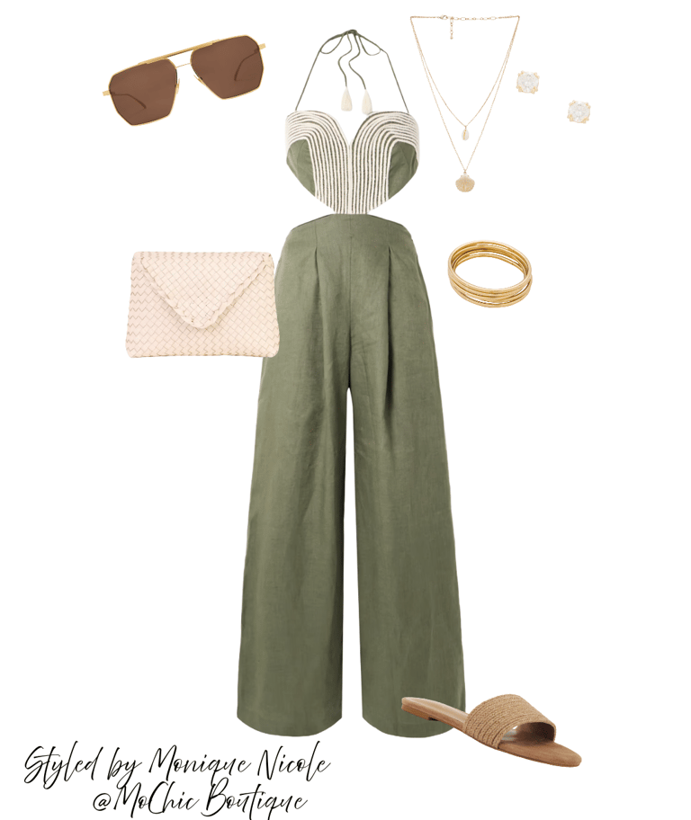 Linen Halter Jumpsuit: With a flattering neckline that beautifully accents the shoulders, this piece effortlessly turns heads, perfect for dining under the stars.